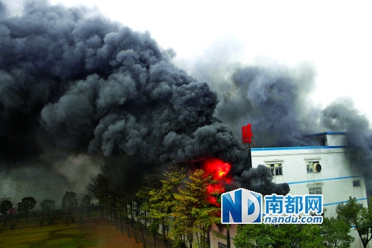 2014年2月9日上午,东莞沙田镇大泥村三胜橡胶厂的厂房突然发生火灾,放在车间内的成品和半成品等在大火燃烧了数个小时后付之一炬。橡胶燃烧产生大量浓烟,大泥村将周围500多名群众紧急疏散至安全地带。火灾事故未造成人员伤亡。南都记者方光明 莫晓东 摄影报道